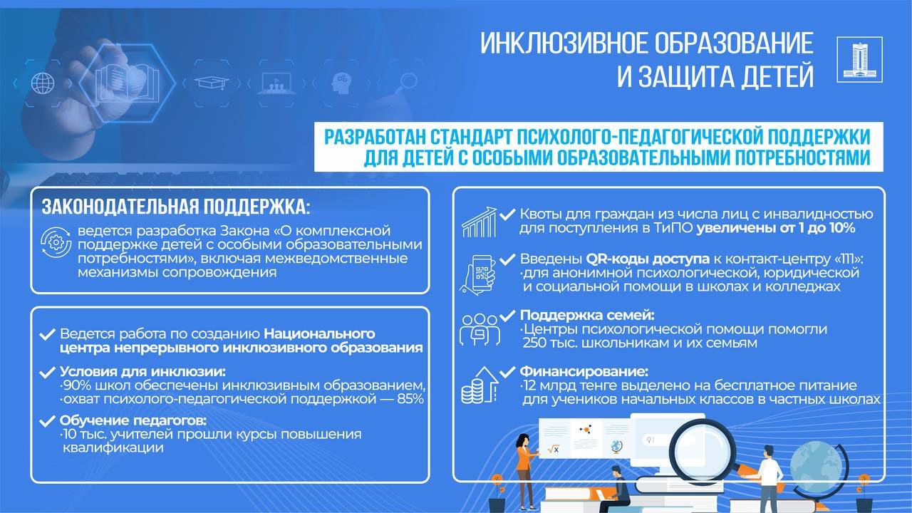 🔷 Ведется работа по созданию Национального центра непрерывного инклюзивного образования. В 90% школах страны созданы условия для получения инклюзивного образования, а охват детей специальной психолого-педагогической поддержкой достиг 85%. Сеть специальных организаций образования достигла 504 единиц. Открыт 121 кабинет поддержки детей с особыми образовательными потребностями при школах.